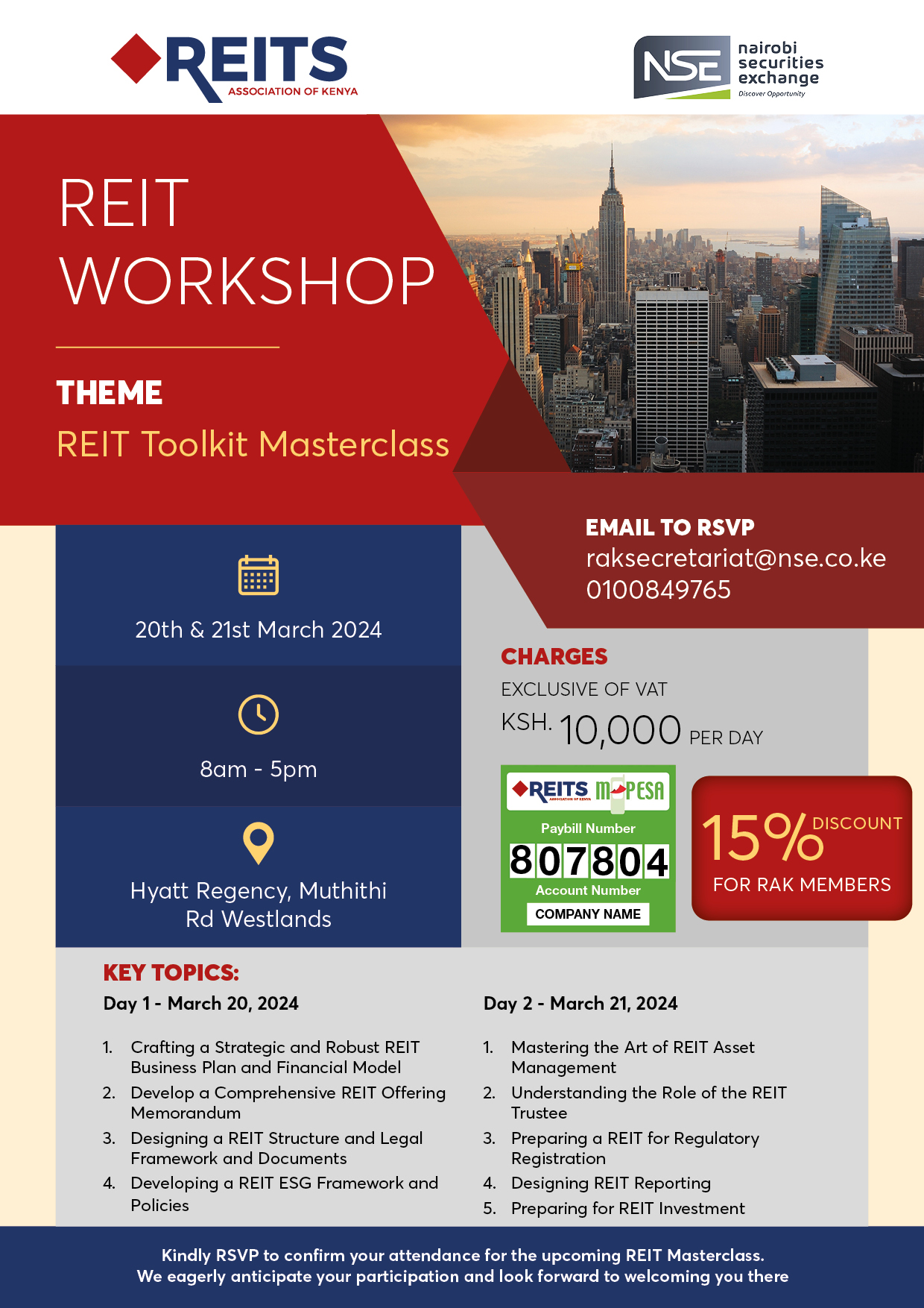 REIT Workshop About THEME: REITS TOOL MASTERCLASS Key Topics: Crafting a Stategic and Robust REIT Business Plan and Financial Model Develop a Comprehensive REIT Offering Memorundum Designing a REIT Structure and Legal Framework and Documents Developing a REIT ESG Framework and Policies Mastering the Art of REIT Management Understanding the Role of the REIT Trustee Preparing a REIT for Regulatory Registration Designing REIT Reporting Preparing for REIT Investment ResourcesEvent Flier - Download 20th & 21st March, 20248am - 5pm Hyatt Regency, Muthithi Rd. Westlands